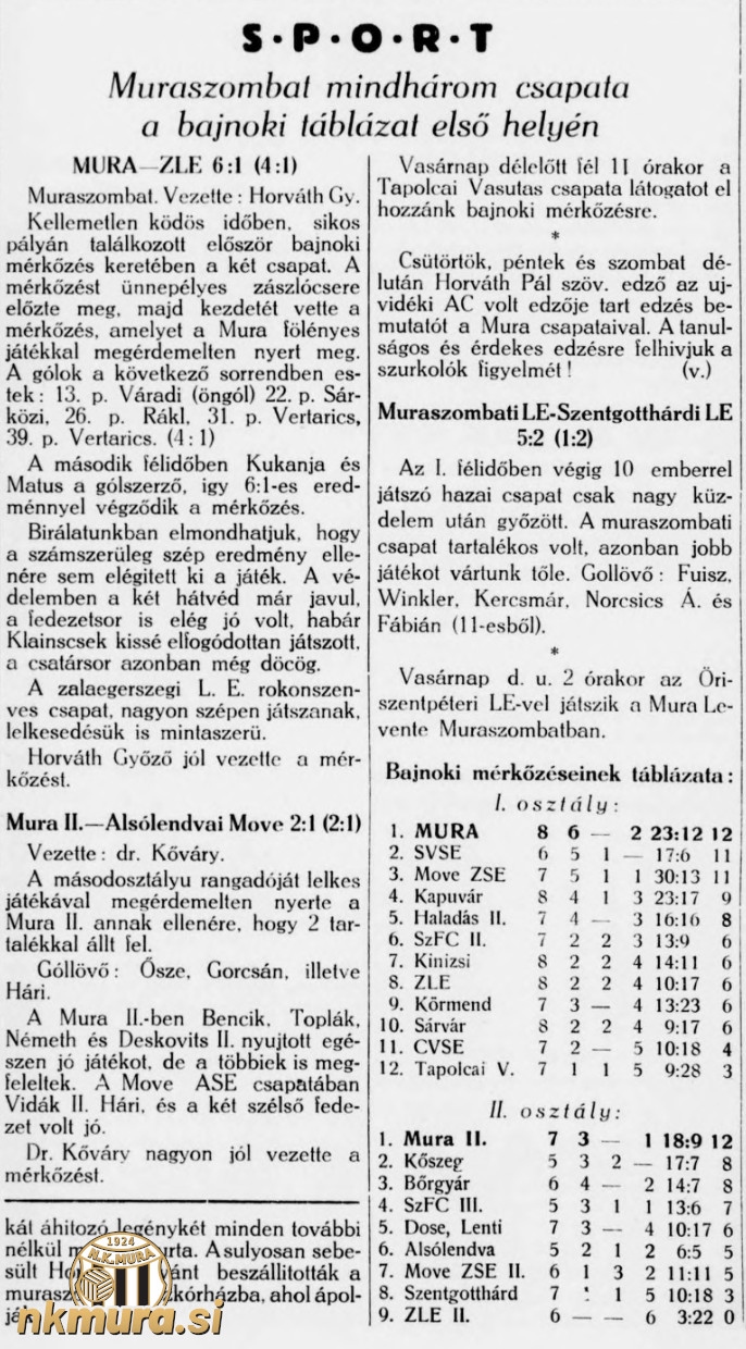 Zmagoviti niz je nadaljevala tudi druga ekipa Mure, ki se je v prekmurskem derbiju pomerila s prvo ekipo Lendave. Končni rezultat 2:1 je bil dosežen že v prvem polčasu. Za Muro sta zadela Ösze in Gorčan, za Lendavo pa Hari. Pri Muri so dobro igrali Bencik, Toplak, Nemeth in M. Deškovič, pri Lendavi pa Hari in Vidak II.