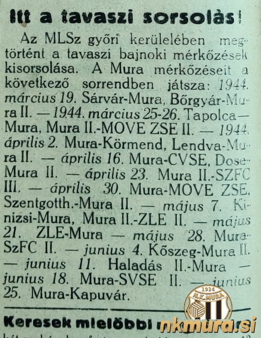 V Györu so izžrebali pare spomladanskega dela prvenstva v I. in II. razredu severnopodonavskega okrožja, kjer tekmujeta obe ekipi Mure. Prvenstvo v obeh skupinah se prične 19. marca 1944, ko bosta obe ekipi gostovali.