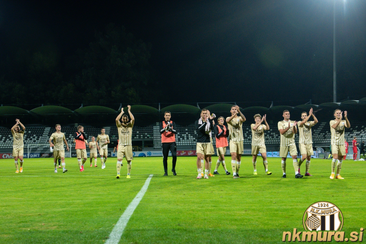 Lepa gesta nogometašev Mure - pozdravili so severno tribuno, kjer tokrat ni bilo navijačev. Avtorske pravice: nkmura.si Foto: Aleš Cipot/fotolens.si