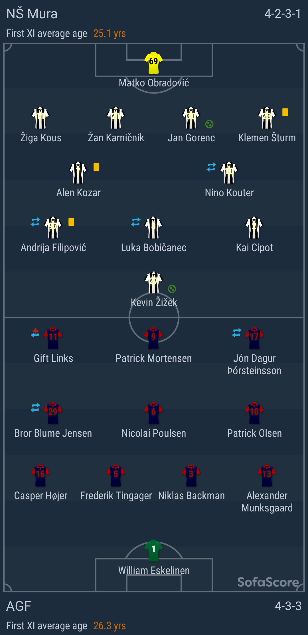 V 77. minuti so bili gosti spet zelo blizu zadetka, a je Žiga Kous na golovi črti preprečil veselje Patricku Mortensenu. Tudi zatem so Danci prišli do nekaj strelov, a posebej nevarni niso bili, tako da Matko Obradović ni imel resnih preizkušenj. zato pa so v peti minuti sodniškega dodatka še enkrat udarili domači nogometaši, po novem protinapadu je na koncu atraktivno s peto zadel Amadej Maroša za veliko zmago Mure.