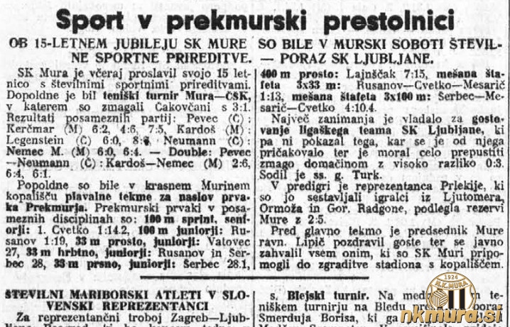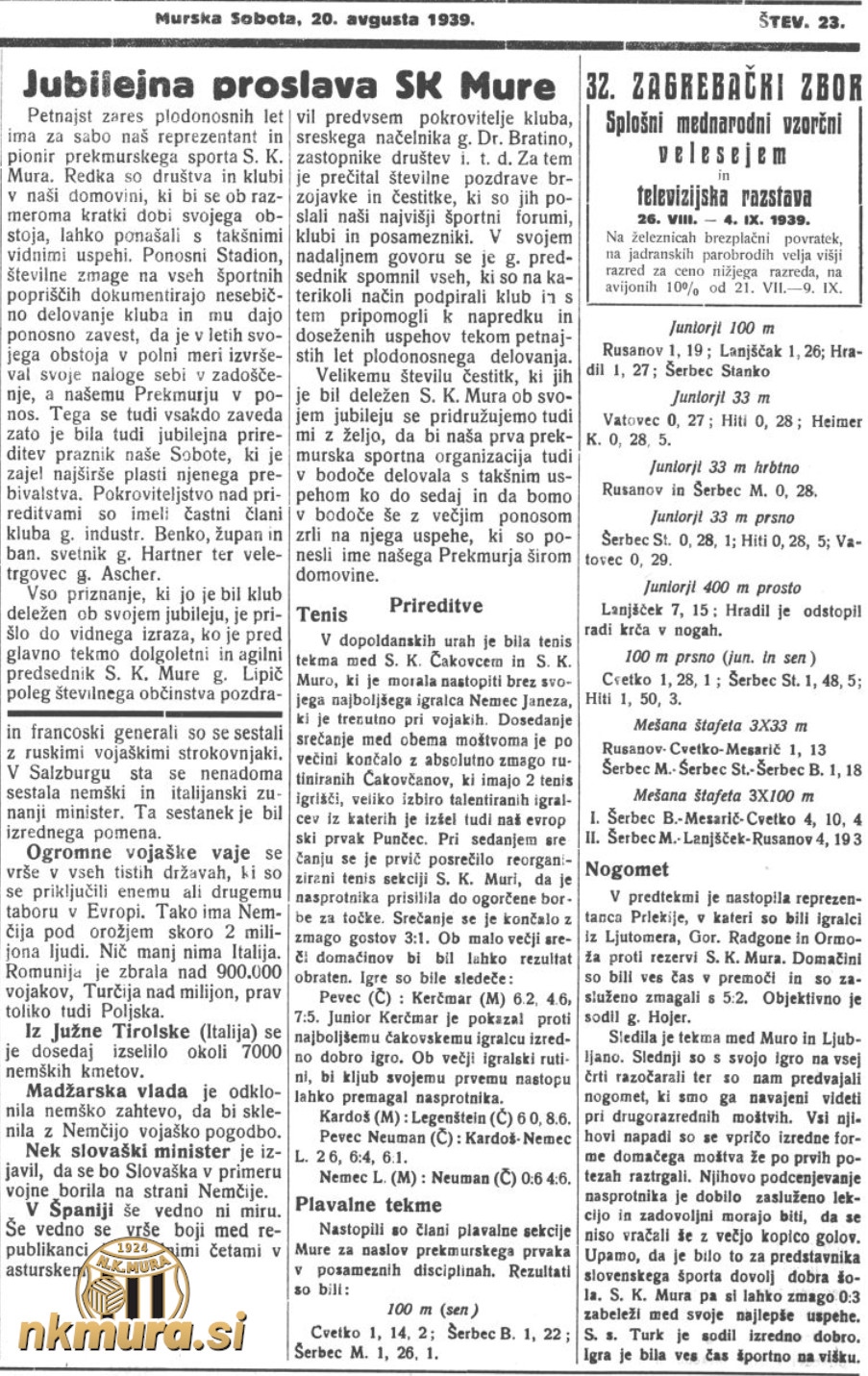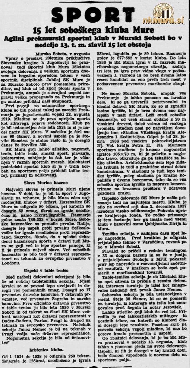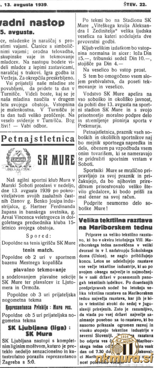 V nedeljo, 13. avgusta 1939, je SK Mura proslavila petnajst let svojega delovanja. Bogat športni program se je pričel že dopoldne, končal pa s popoldansko tekmo med Muro in Ljubljano. Prireditev je potekala pod pokroviteljstvom častnih članov industrijalca Josipa Benka, župana Ferdinanda Hartnerja in dolgoletnega predsednika kluba in trgovca Vincenca Arvaija.