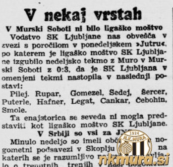 Pred glavno tekmo, ki se je pričela ob 17.00 je zbrane pozdravil predsednik kluba Josip Lipič jim zaželel dobrodošlico ter se zahvalil vsem pokroviteljem, sreskemu načelniku dr. Bratini in zastopnikom društev. Predsednik se je spomnil še vseh, ki so kakorkoli pomagali in podpirali klub pri njegovem razvoju. Nato sta se pomerili enajsterici Mure in kombinirane ekipe Ljubljane, ki nastopa v državnem prvenstvu Jugoslavije. Črno-beli so Ljubljano porazili s 3:0.