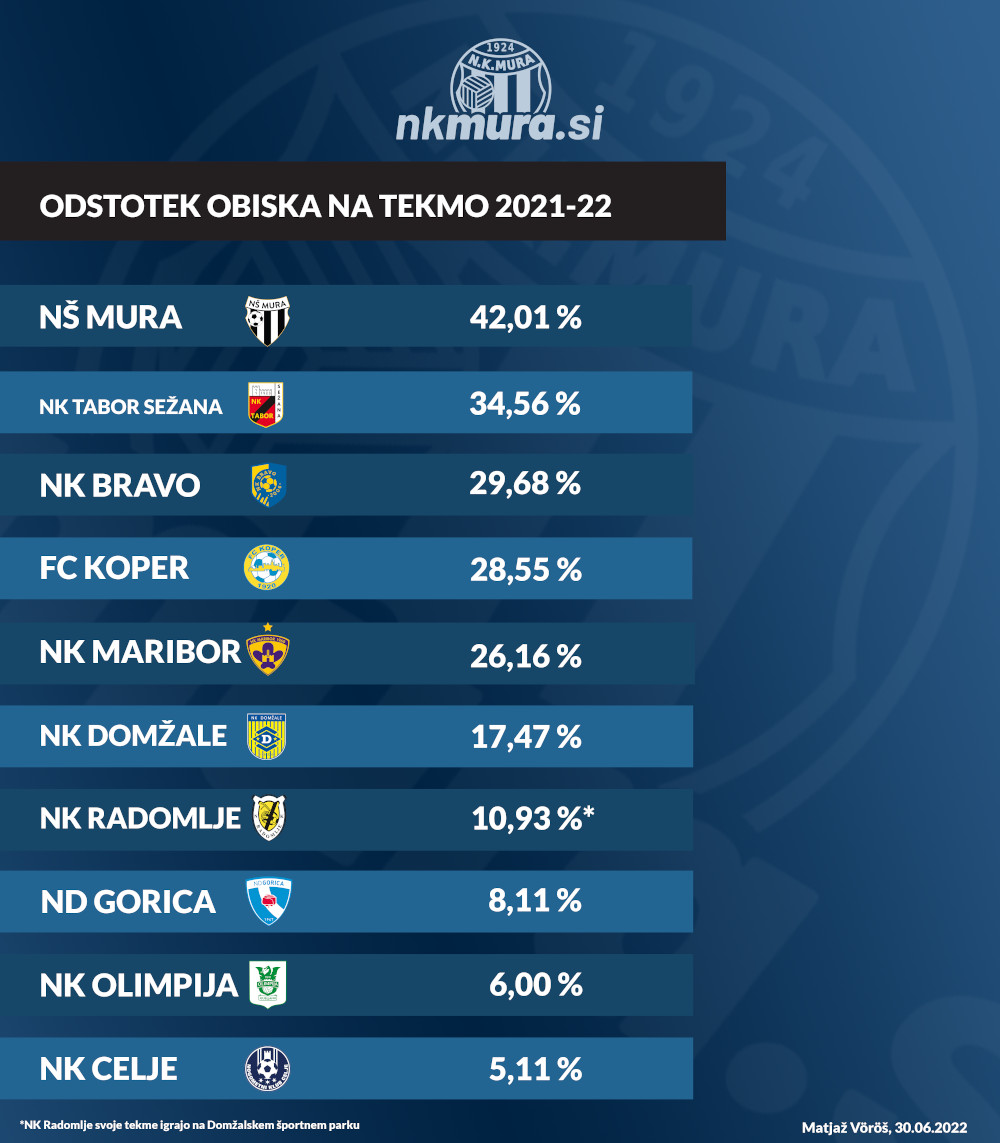 Vendar pa največji odstotek napolnjenosti tribun ne pripada Štajercem, ampak pristašem Mure. Mura je svoj stadion Fazanerija, z novo kapaciteto 4506, povprečno popolnila z 42 % gledalcev. Ne preseneča, da sledijo predvsem stadioni z manjšo kapaciteto kot recimo Stadion Rajka Štolfe, ki je bil napolnjen z dobrimi 34 %. Sledijo mu še ŽAK, Bonifika in naposled Ljudski vrt z 26 %.