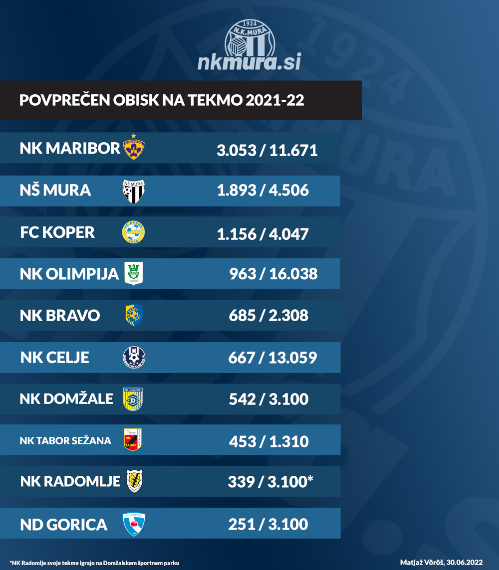 Največji obisk pripada NK Maribor, ki je imel na domačih tekmah podporo 54.949 gledalcev. Sledita NŠ Mura z 34.075 in mogoče za nekatere presenetljivo FC Koper 20.800 gledalci.
