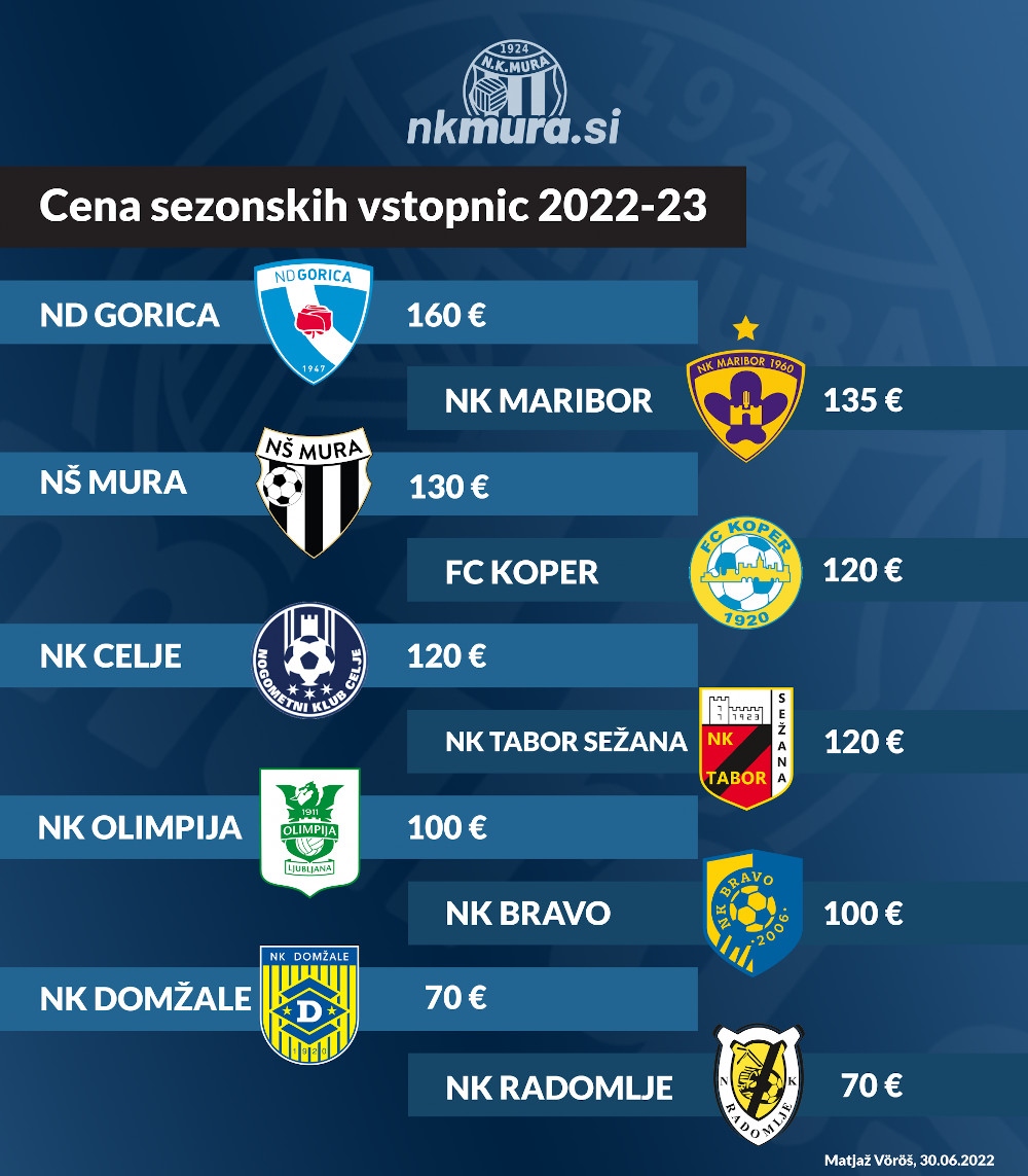 V vrsto kot tretja vstopi NŠ Mura. Za sezonsko vstopnico morate pri nas odšteti 130 €. Za glavno tribuno je potrebno primakniti nekaj več, in sicer 160 €. Navijači lahko tako muraše spremljamo za dobrih 7 € na tekmo, kar je 1 € ceneje, kot če bi vstopnice kupovali sproti. S tem na tekmo ne prihraniš niti za kepico sladoleda.