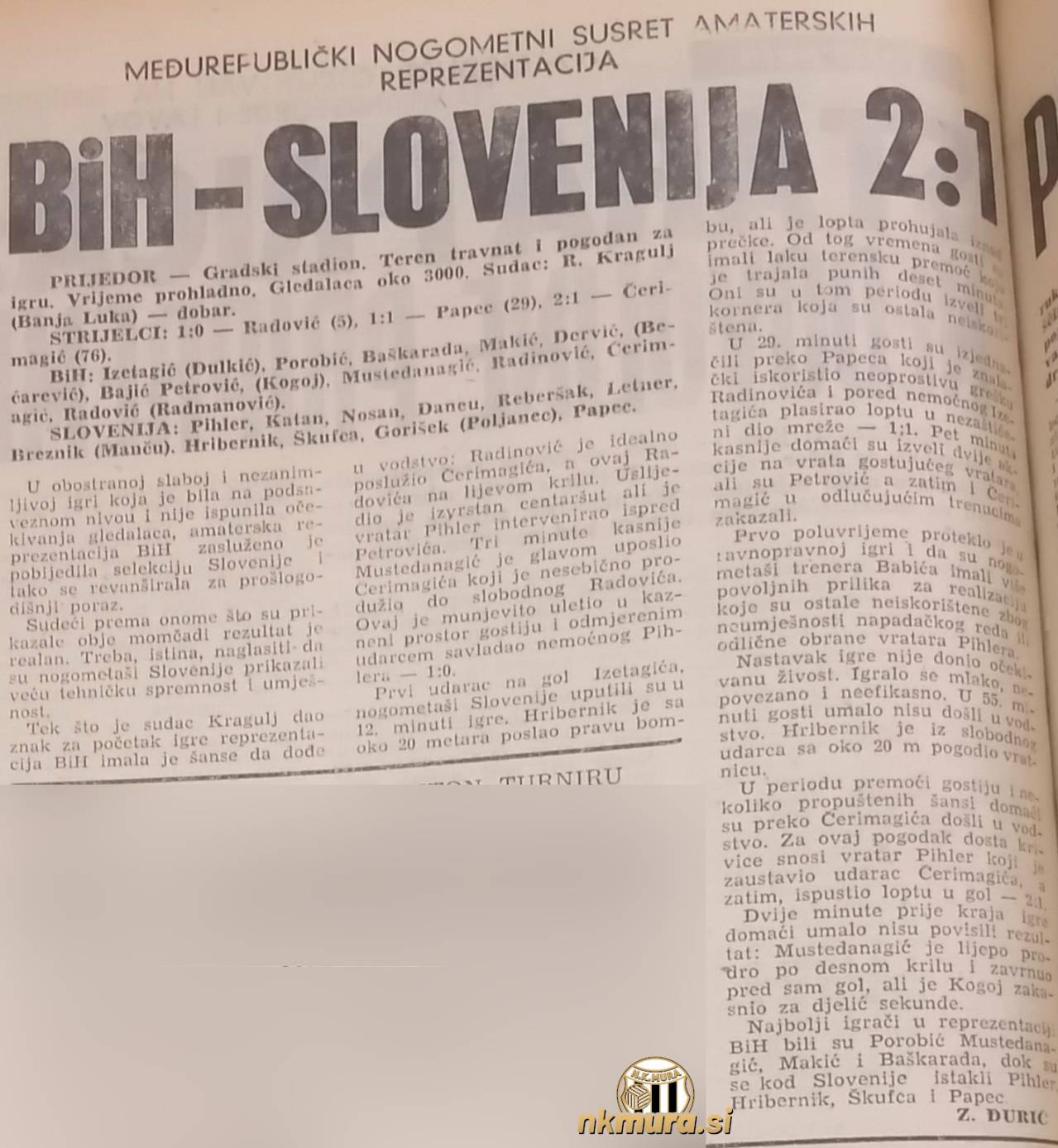 Amaterska nogometna reprezentanca Slovenije je v Prijedoru odigrala medrepubliško nogometno tekmo proti Bosni in Hercegovini. Pred okrog 3000 gledalci se je dvoboj končal z zmago BiH z 2:1. Za slovensko reprezentanco je branil vratar Mure Alojz Pihler. Kot poročajo Sportske novosti je bil vratar Mure med najboljšimi Slovenci.