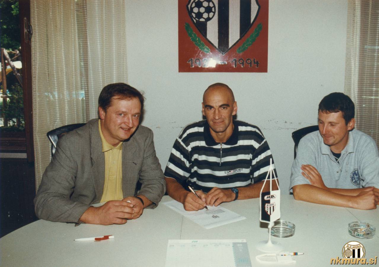 Marijan Bakula, ko je leta 1993 podpisal pogodbo z Muro. Levo je takratni direktor Mure Ervin Kerčmar. Avtorske pravice: nkmura.si Foto: arhiv Ervina Kerčmarja