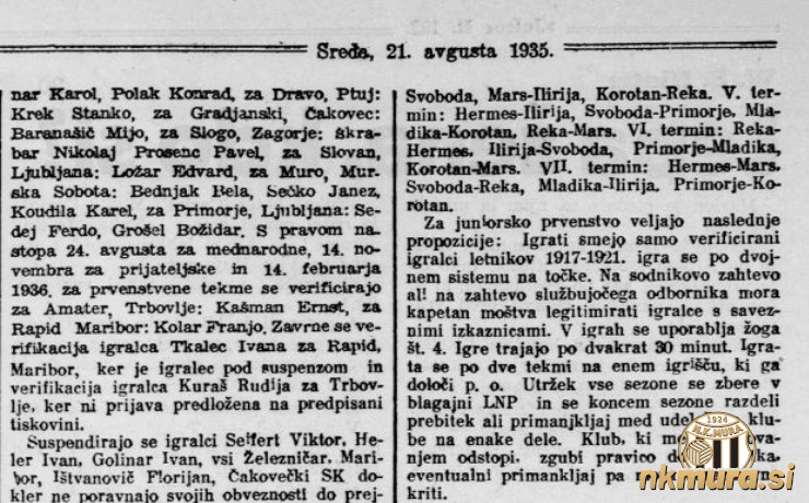 V zadnjih dneh avgusta so k Muri pristopili trije novi igralci: Bela Bednjak, Janez Sečko in Karel Kodila. Janez Sečko je povratnik v Muro, saj je za črno-bele igral leta 1933, nato pa prestopil k modro-rdečim mestnim tekmecem, Panoniji. Vsi trije imajo pravico nastopa 24. avgusta 1935.
