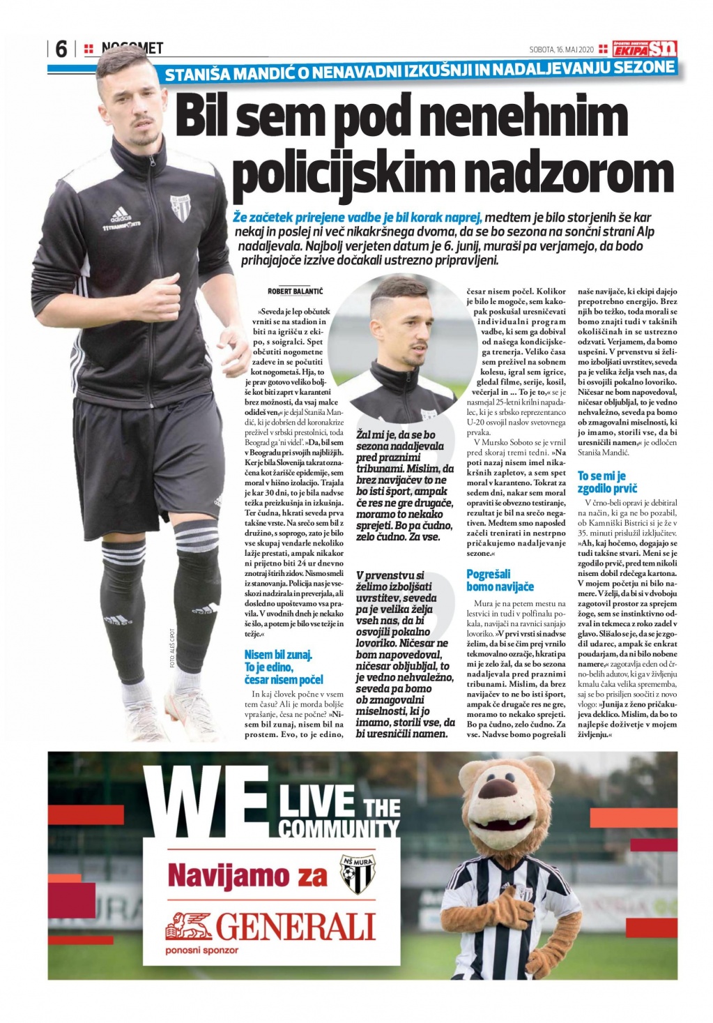 Staniša Mandič je Muro okrepil v zimskem prestopnem roku 2019/2020. Karanteno zaradi koronavirusa je občutil v polnem obsegu, saj je moral biti najprej 30 dni v hišni izolaciji v Beogradu, nato pa še sedem dni v Sloveniji. Kot pravi je komaj čakal, da se vrne na igrišča.