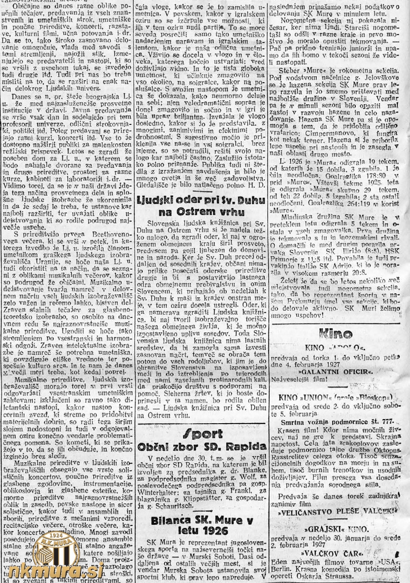 Športni klub Mura se je udejstvoval tudi na družabnem področju in v medijih smo lahko velikokrat zasledili, da je prav Mura tista, ki v Murski Soboti skrbi, da družabno udejstvovanje v našem mestu ne usiha. Tako so leta 1926 v soboškem kinu Dittrich organizirali opereto, katere dobiček je šel za delovanje kluba in prireditev ob Miklavževem večeru.