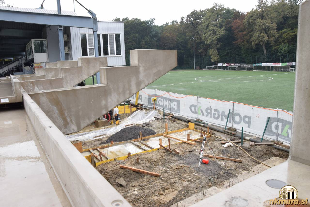 Tudi danes smo spremljali gradnjo severozahodne tribune. Dela so se že pred časom preselila za tribuno, kjer poteka betoniranje temeljev. Gradnjo otežujeta deževno vreme in blato. Po končanem betoniranju bo sledil že izkop vrhnje zemlje in nasutje z gramozom. Delček stanja prinašamo na spodnjih fotografijah.