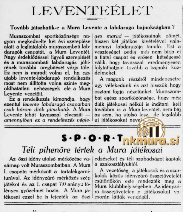 Dve leti je od tega odkar je Mura ustanovila levente oz. mladinsko ekipo. V tem času je ekipa dosegla odmevne zmage iz nje pa prišlo kar nekaj dobrih igralcev. Kot vse kaže bo v veljavo stopil pravilnik, ki določa, da lahko v levente ekipi igrajo le trije študenti. Če se bo res zgodilo, bo Mura ostala brez večine igralcev in s tem mlade nogometne ekipe.