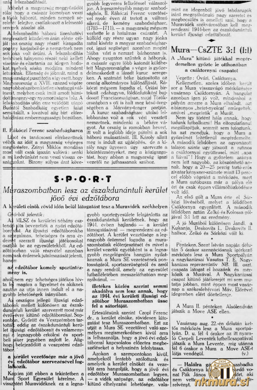 Vodstvo Mure si prizadeva, da bi tabor v letu 1944 potekal v Murski Soboti. Vsled tega bo predsednik okrožja Ferenc Czopf v kratkem obiskal Muro in se srečal z vodstvom kluba.