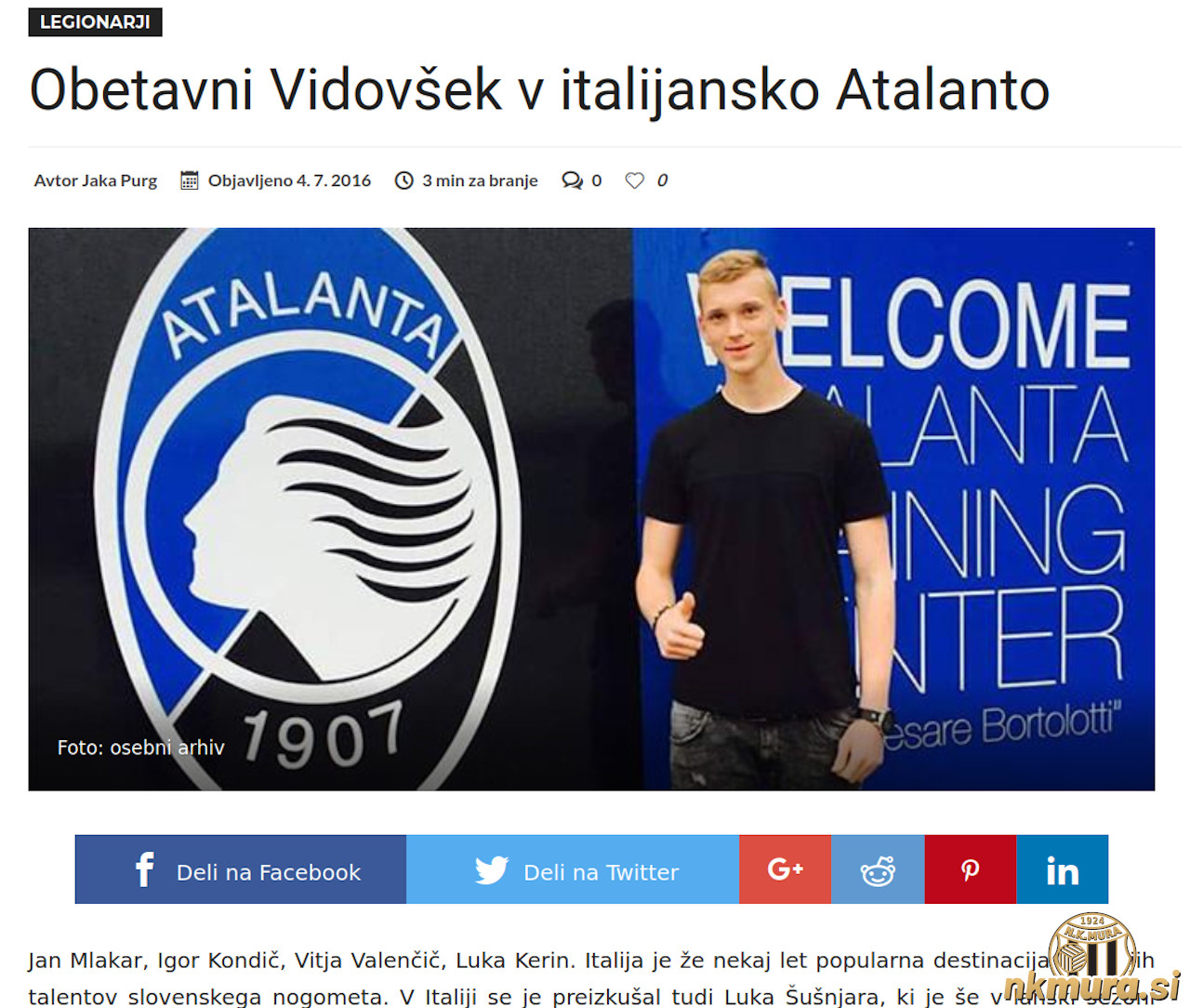 Vidovšek je 4. julija 2016 odšel v Atalanto. Avtorske pravice: nkmura.si Foto: snportal.si