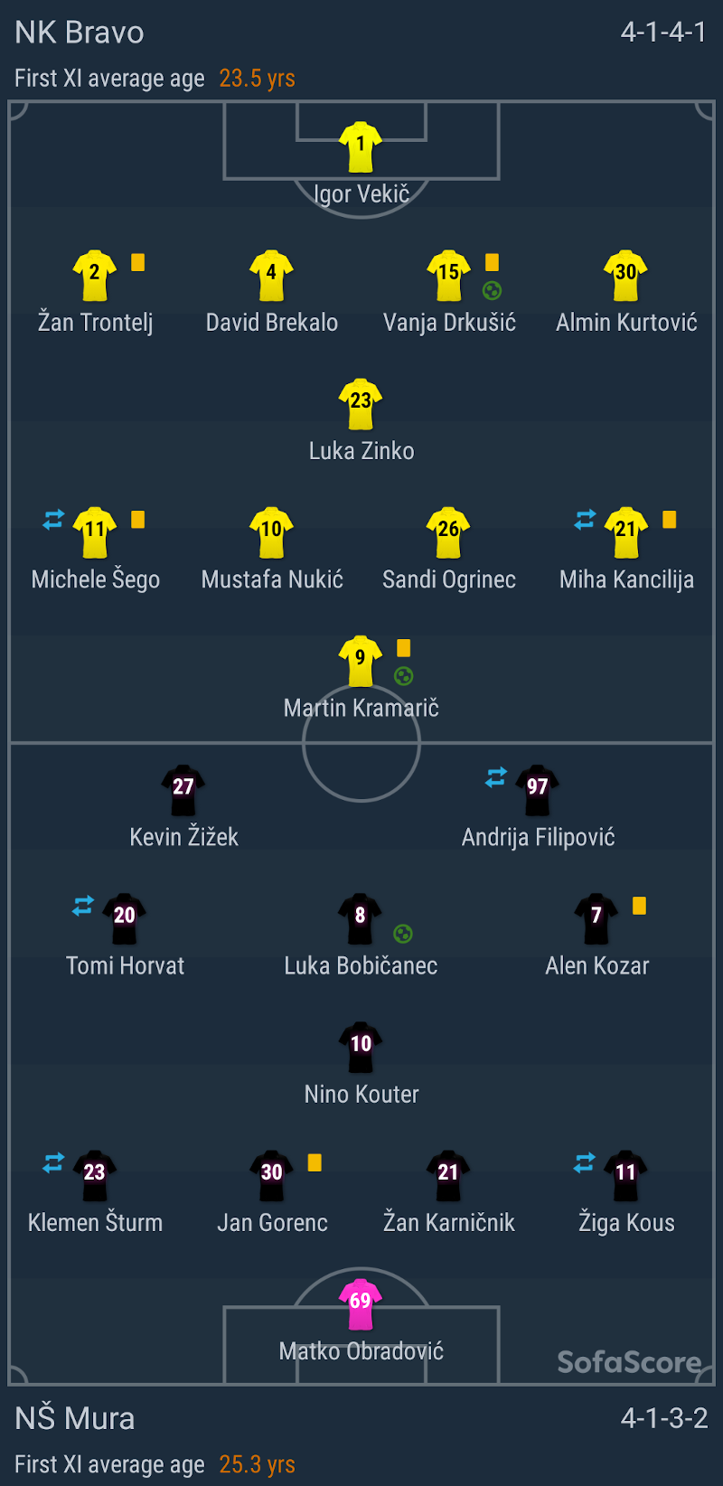 * Bravo: Vekić, Kurtović, Drkušić, Brekalo, Trontelj, Žinko, Ogrinec, Kramarič, Nukić, Kancilija (od 90. Kidrič), Šego (od 79. Mensah).