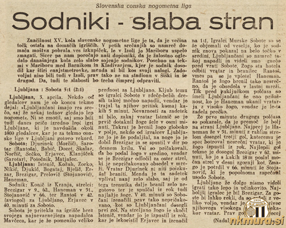 Najboljši igralec tekme je bil Brezigar, največji krivec visokega poraza Sobote pa sta bila oba vratarja. Sodnik Konič iz Kranja ni sodil najbolje, saj je spregledal nekaj resnih prekrškov, med katerimi je bila najbolj očitna roka na robu kazenskega prostora Ljubljane. Sobočani se po petnajstih odigranih tekmah nahajajo na osmem mestu.