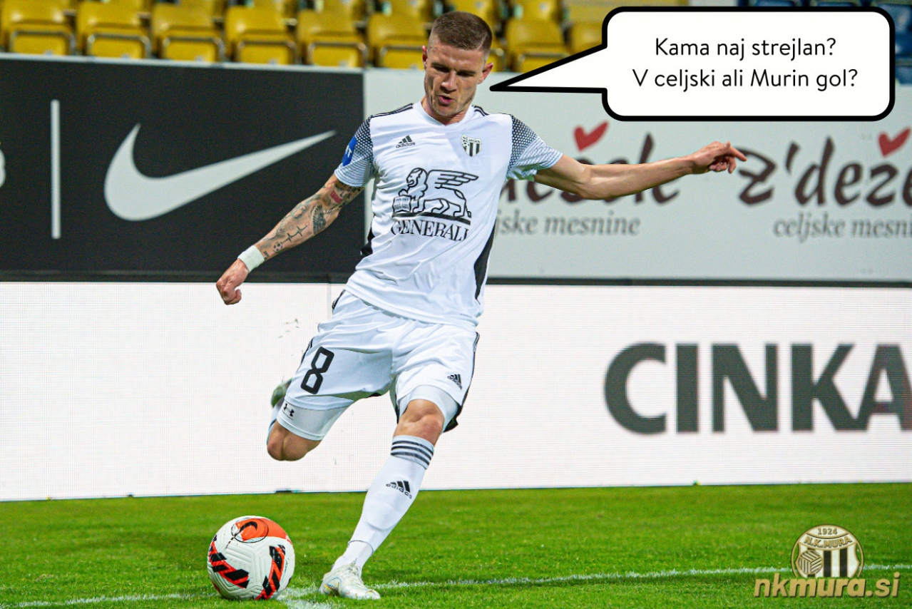 Luka Bobičanec se odloča v kateri gol bo streljal v prihodnje. Celjani očitno radi ribarijo v Muri. Avtorske pravice: nkmura.si Foto: Aleš Cipot, montaža nkmura.si