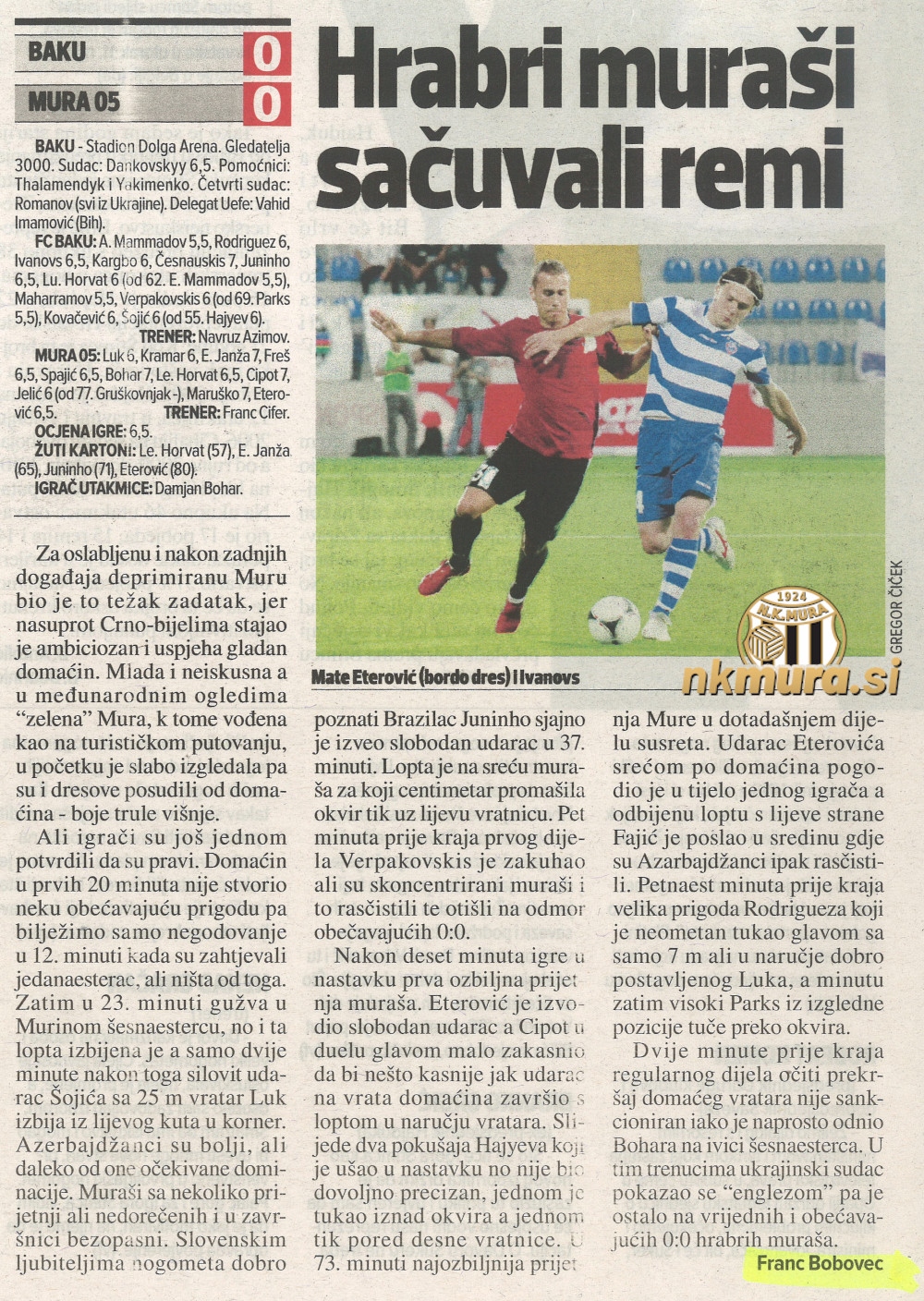 31 - Zelo lepa priložnost za Muro. Po kotu Jelića, je žoga prišla na drugo vratnico do Boharja, ki je z glavo streljal naravnost v vratarja Bakuja.