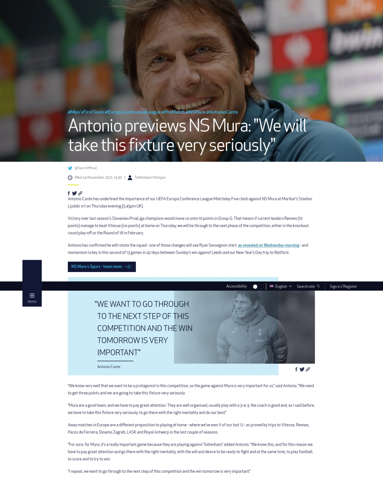 Nogometaši Tottenhama so se na tekmo proti Muri pripravljali v svoji bazi v Angliji, kjer so opravili tiskovno konferenco in trening. Trener Antonio Conte je dejal: "Želimo biti uspešni v tem tekmovanju, zato je tekma za nas zelo pomembna. Naša želja so tri točke. Mura je dobra in nevarna ekipa, zato bomo morali biti zelo pazljivi in tekmo vzeti resno. So dobro organizirani, običajno igrajo v sistemu 3-4-3 in imajo dobrega trenerja. Tekma je pomembna tudi za Muro, ker igra proti Tottenhamu."