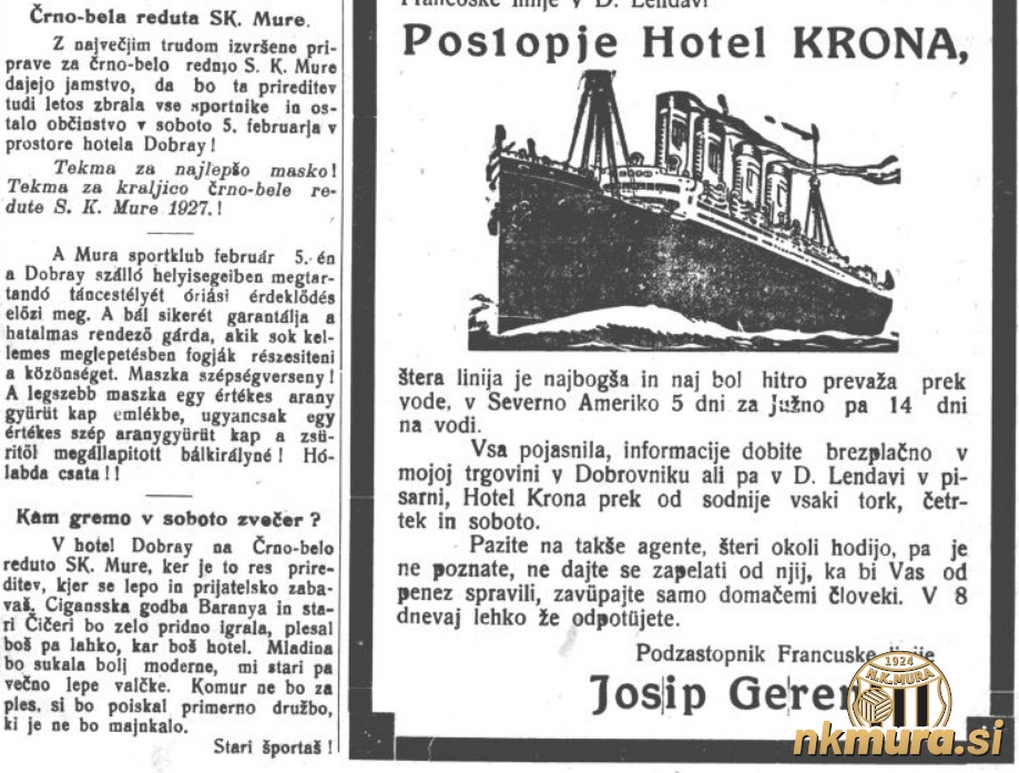 Športni klub Mura je 5. februarja 1927 ob 20.00 organiziral črno-belo reduto. Potekala je v hotelu Dobrai. Reduta je pustno rajanje v maskah.