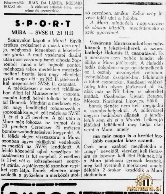 Nogometaši Mure so zabeležili četrto zaporedno zmago. Tokrat so v Sopronu premagali drugo ekipo Soproni Vasutas (SVSE) z 1:2. Polčas se je končal z 1:1.