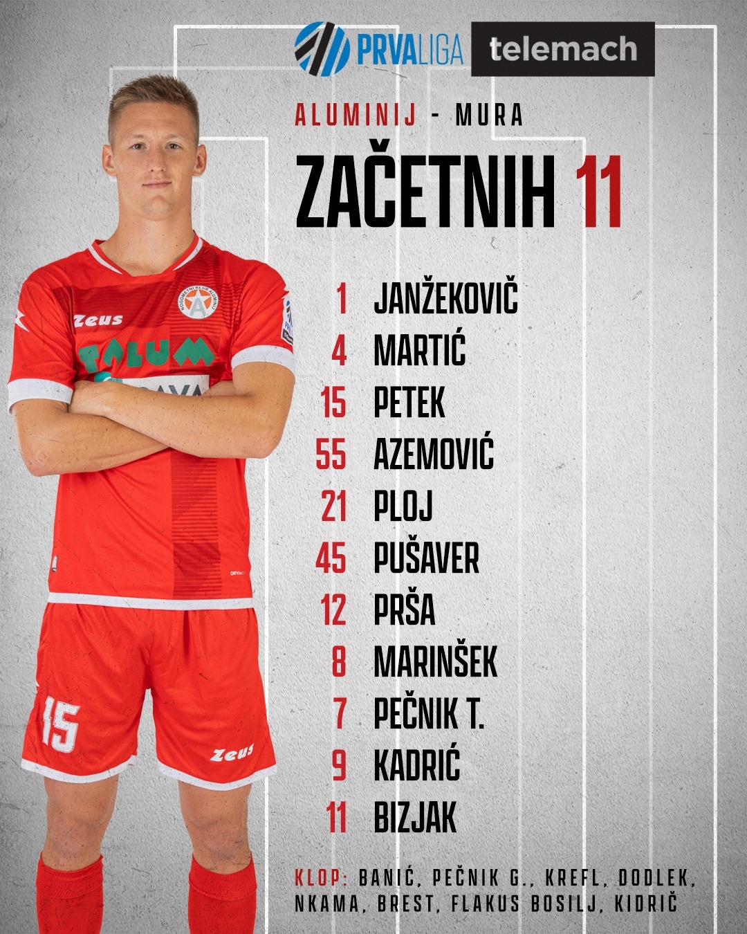 Aluminij: Janžekovič, Martić, Petek, Azemović, Ploj (od 78. Nkama), Pušaver, Prša, Marinšek, T. Pečnik (od 62, Krefl), Kadrić, Bizjak (od 62. Flakus Bosilj). Trener: Oskar Drobne