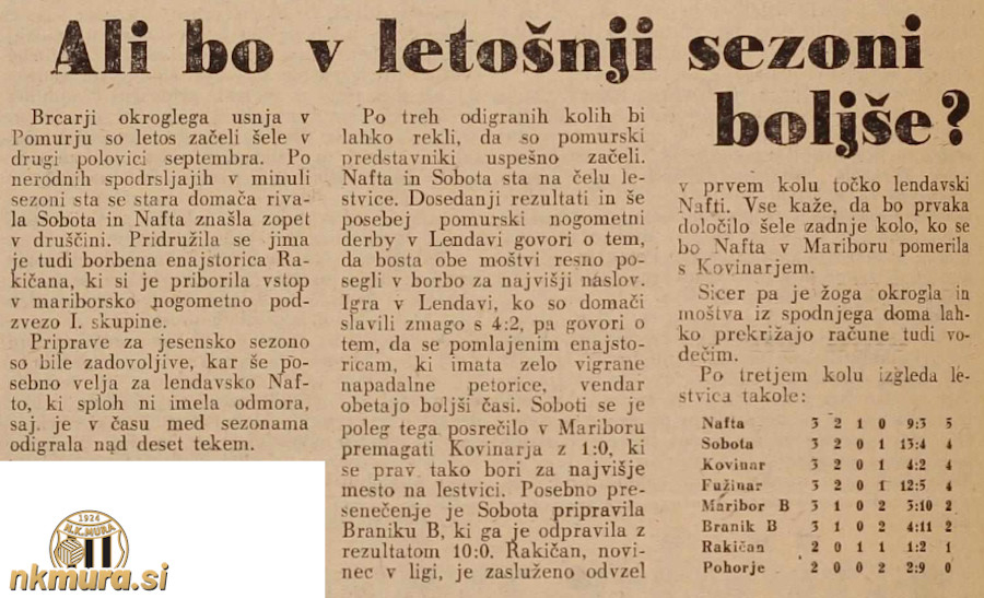1. Nafta 3 2 1 0 9:3 5 2. Sobota 3 2 0 1 13:4 4 3. Fužinar 3 2 0 1 12:7 4 4. Kovinar Maribor 3 2 0 1 4:2 4 5. Branik B 3 1 0 2 4:11 2 6. Maribor B 3 1 0 2 3:10 2 7. Rakičan 2 0 1 1 1:2 1 8. Pohorje 2 0 0 2 2:9 0