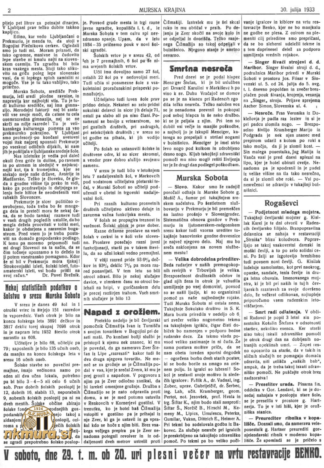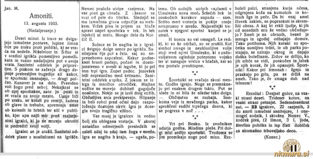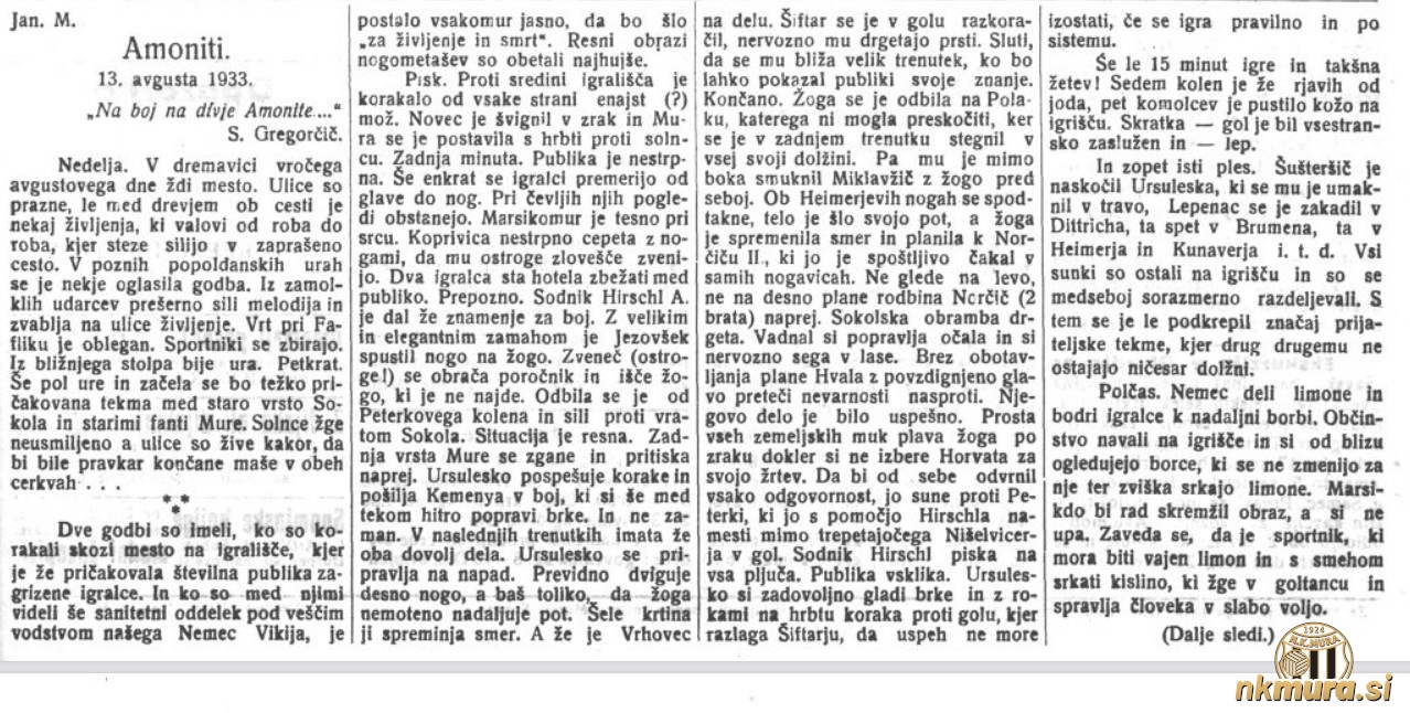 13. avgusta 1933 je bila v Murski Soboti dobrodelna nogometna tekma med predstavniki Sokola in Mure. Tekma bi morala biti 29. julija, vendar je bila zaradi slabega vremena prestavljena na kasnejši termin. Povod za tekmo je slabo stanje trboveljskih rudarjev in njihovih družinskih članov. V ta namen potekajo številne dobrodelne akcije širom države.