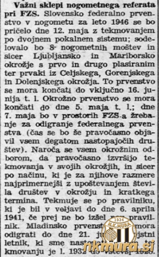 Fizkulturna zveza Slovenije (FZS) je sporočila, da se bo slovensko federalno prvenstvo za leto 1946 pričelo 12. maja 1946 in se mora končati do 16. junija 1946. Tekmovalo se bo po dvojnem pokalnem sistemu, sodelovalo pa bo 8 moštev. Ljubljansko in Mariborsko okrožje bosta predstavljala prva dva kluba, sodelovali pa bodo tudi prvaki Celjskega, Gorenjskega in Dolenjskega okrožja.