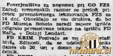 Fizkulturna zveza Slovenije (FZS) je sporočila, da se zaradi neugodnih vremenskih razmer in zasneženih igrišč prvenstveni dvoboji preložijo za dva tedna. Murska Sobota bi morala v prvih dveh krogih igrati proti Kladivarju in Novemu mestu. Ta dva kroga sta prestavljena na kasnejši termin. Po razporedu bodo naši nogometaši igrali naslednjo tekmo 9. marca v Ljubljani proti Enotnosti.
