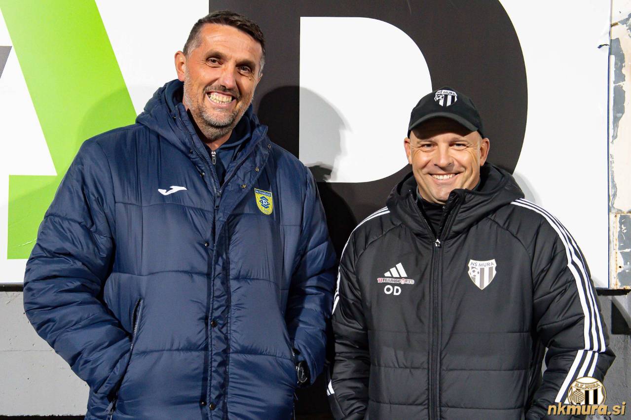 Nasmeh stratega Domžal in Mure Dejana Dončića in Oskarja Drobneta pred 64. prvenstveno tekmo teh dveh tekmecev. Avtorske pravice: nkmura.si Foto: Aleš Cipot/fotolens.si