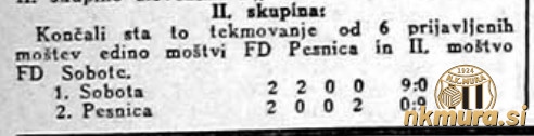 Končano je prvenstvo v II. skupini mariborskega okrožja v kateri je tekmovalo drugo moštvo Sobote. Prvenstvo sta končali le dva ekipi in sicer Sobota II ter Pesnica.