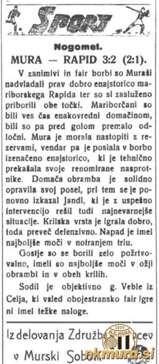 Mura je igrala zelo dobro, posebej razpoložena pa je bila ožja obramba na čelu z vratarjem Slavkom Jandlom. Za Muro je dva zadetka dosegel Jože Bosina, enega pa Rudolf Pevec. Za Rapid sta zadela Kreiner in Hardinka.