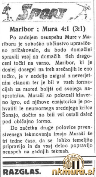 Mura je igrala brez najboljšega strelca Jožeta Bosine, igra pa je bila daleč od pričakovane. Najboljši igralci Mure so bili Kukanja, Šonaja in Jandl. Za Muro je v 35. minuti zadel Pavel Čebulj.