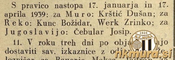 Dušan Krstić, ki je bil za Muro verificiran v sezoni 1936/1937, se je po krajši epizodi v Čakovečkemu Š.K., vrnil nazaj v Muro. Njegovo igralno mesto je vratar. Verificiran je bil 18.10.1938, pravico nastopa pa ima od 17. januarja 1939 naprej.