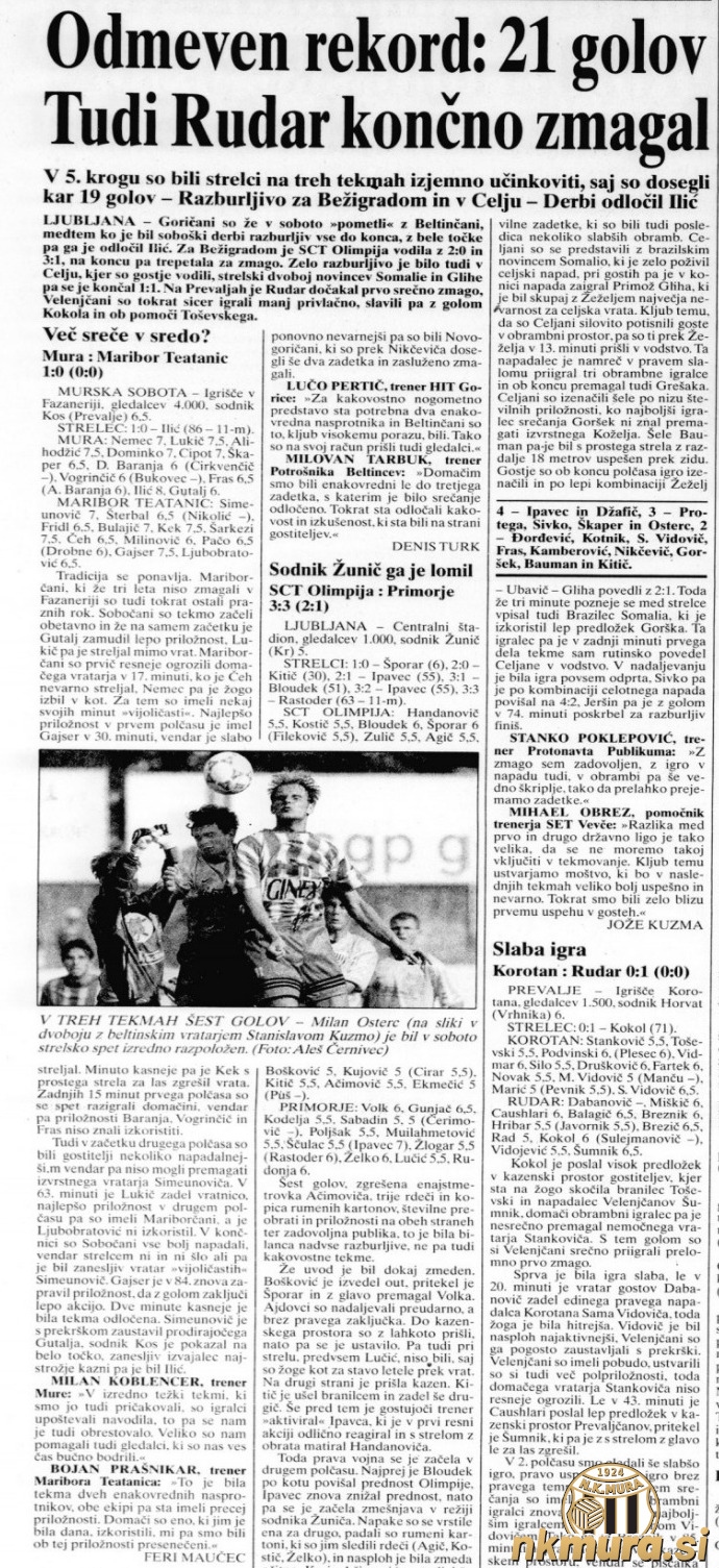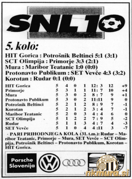 Peti krog prvenstva v sezoni 1997/1998 je zaznamoval prekmursko - štajerski derbi. V Murski Soboti so ga z 1:0 dobili črno-beli, odločilni zadetek pa je tri minute pred koncem iz enajstmetrovke dosegel Srečko Ilić.
