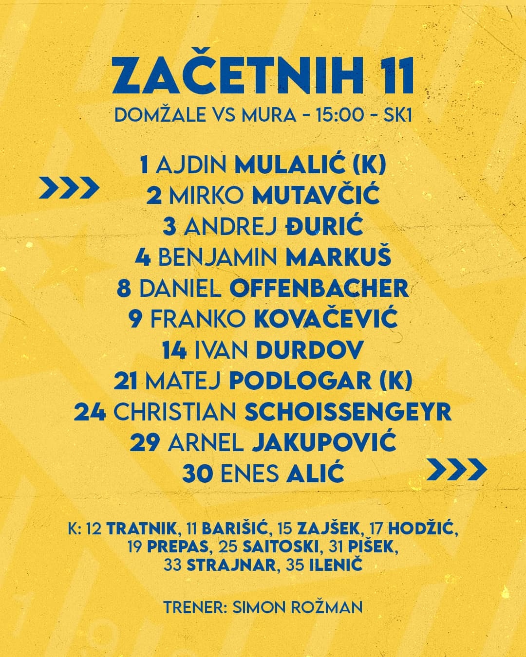 Domžale: Mulalić, Mutavčić, Schoissengeyr, Đurić, Alić, Offenbacher, Markuš, Kovačević (od 60. Saitoski, od 88. Hodžić), Jakupović, Podlogar (od 67. Strajnar), Durdov. Trener: Simon Rožman.