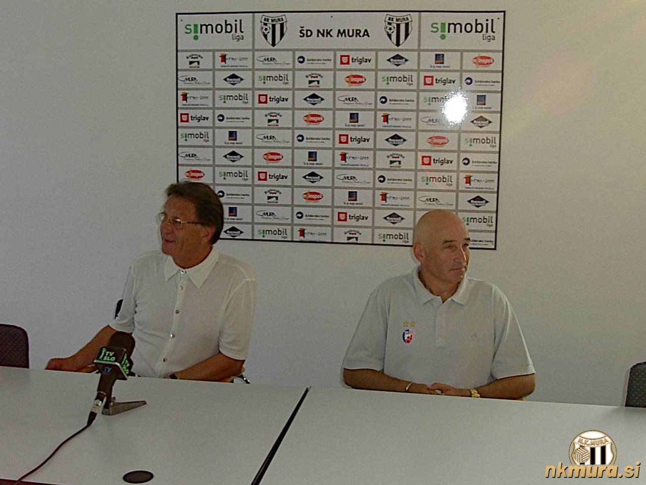 Trenerja na novinarski konferenci po tekmi. Levo Miroslav Blažević in desno Slavoljub Muslin. Avtorske pravice: nkmura.si Foto: Simon Horvat