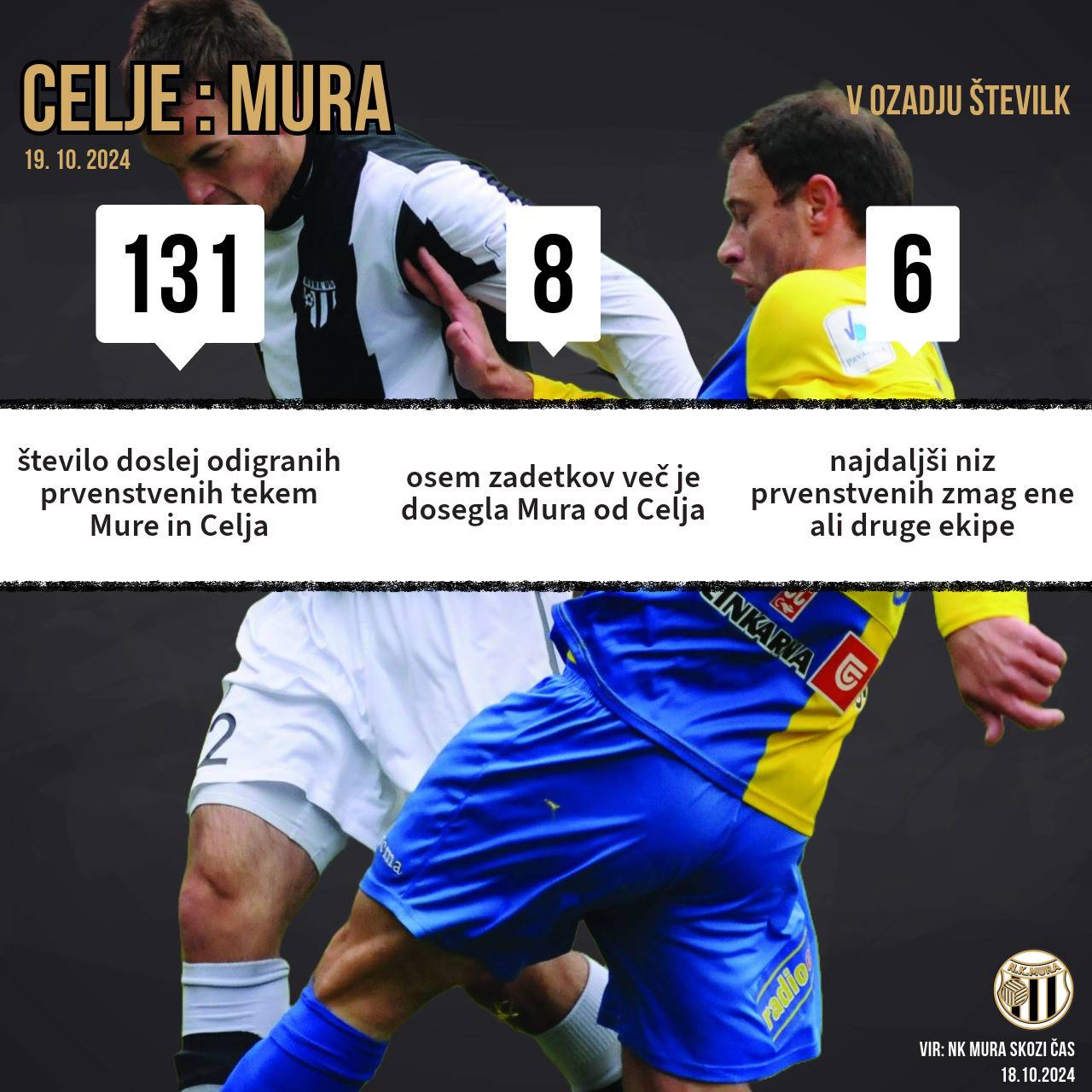 Pred tekmo s Celjem, ki bo v soboto, 19. oktobra 2024 ob 15.00 v Celju, prinašamo tri statistične zanimivosti prvenstvenih dvobojev teh dveh ekip. Gre za klub s katerim je Mura v svoji zgodovini odigrala največ prvenstvenih tekem. Črno-beli so v medsebojnem razmerju za nianso boljši, Celjani pa so ga najbolj popravili leta 2023 in 2024.