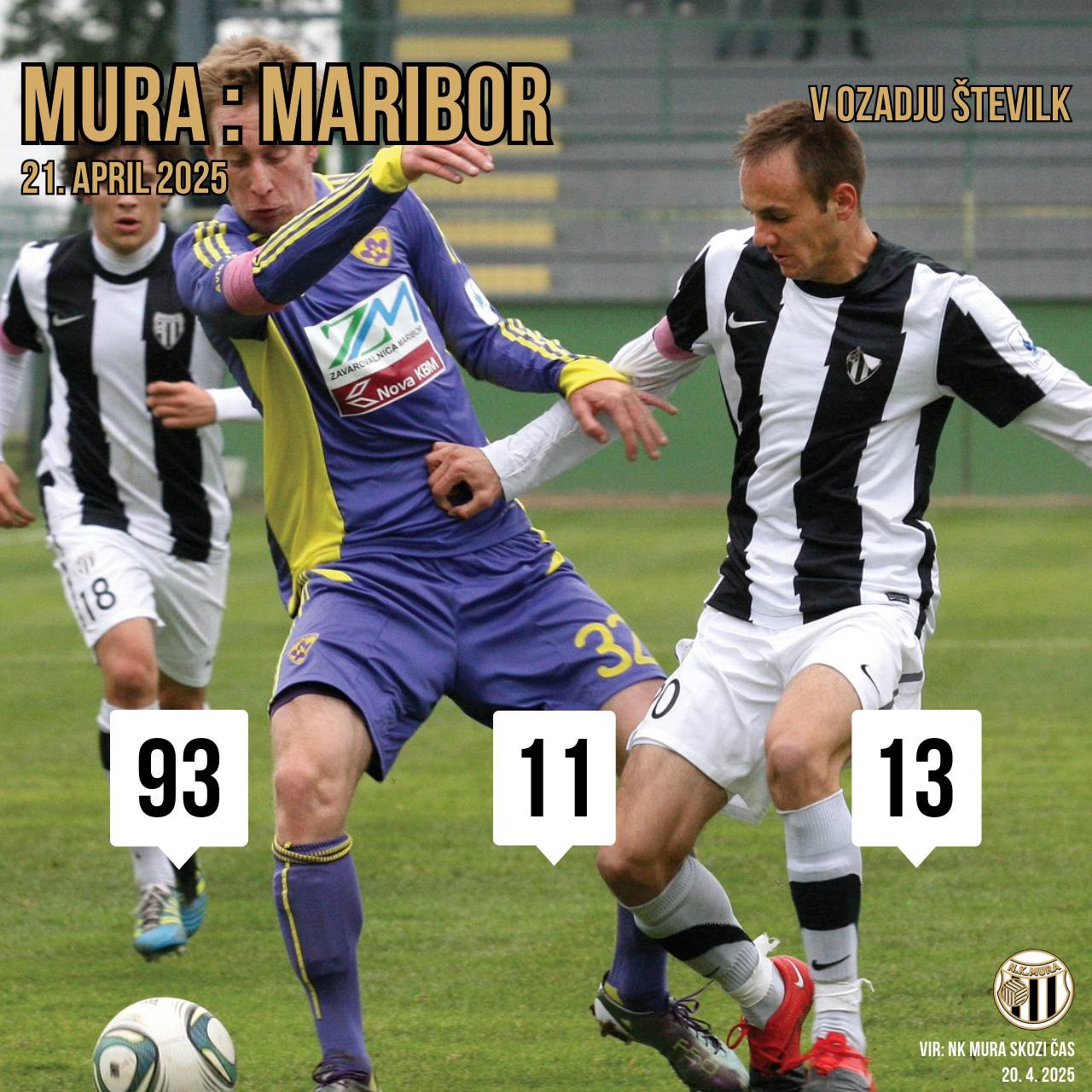 93 - Mura in Maribor sta doslej odigrala 93 prvenstvenih tekem. Mura je dosegla 19 zmag, Maribor pa 48. Tekma se je brez zmagovalca končala 26-krat. Tudi gol razlika je na strani Mariborčanov in znaša 89:157.