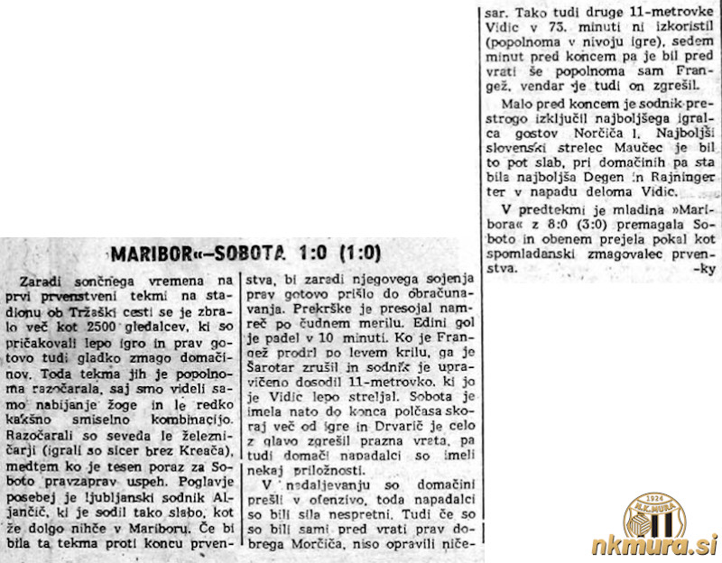 Nogometaši Sobote so v 1. krogu slovenske conske lige gostovali v Mariboru, kjer so se pomerili z Mariborom. Domači so zadeli že v uvodnih minutah in na koncu zmagali z 1:0 (1:0).
