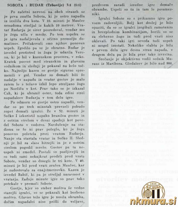 Gostje so prikazali borbeno igro. Glavno težo njihove igre je nosila obramba, napadalci pa niso prišli do veljave. Sobota je s svojo igro povsem zadovoljila. Bolj kot doslej je bilo opaziti, da so se igralci izogibali zamotanim in brezplodnim kombinacijam. Borili so se za sleherno žogo, pred vrati pa niso oklevali.