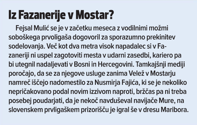 Fejsal Mulić, ki je v sezoni 2019/2020 nosil dres Mure bo kariero najverjetneje nadaljeval v Mostarju pri Veležu. Fejsal je eden izmed štirih igralcev, ki jim je 1. junija potekla pogodba z Muro, klub pa je z igralci ni podaljšal.
