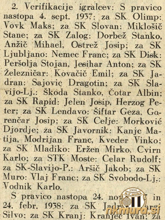 Pred pričetkom prvenstva v sezoni 1937/1938 je k Muri pristopil Franc Vlaj. Vlaj je bil verificiran 24. avgusta 1937, pravico nastopa pa ima od 4. septembra 1937 naprej.
