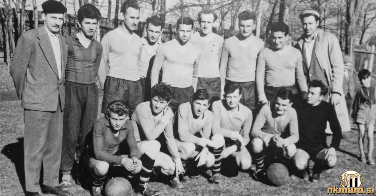 Nogometaši Sobote v sezoni 1962/63. Stojijo od leve: Jože Zver, Zlatko Tkalčec, Vladimir Vrdjuka, Štefan Aki Norčič (trener), Anton Puškarič, Anton Šarotar, Emil Miloševič, Julijan Klepec, Vlado Cvetko (teh. vodja), Čepijo: Štefan Pucko, Geza Fujs, Alojz Drvarič, Feri Maučec, Janez Sečko. Avtorske pravice: nkmura.si Foto: arhiv Ferija Maučeca