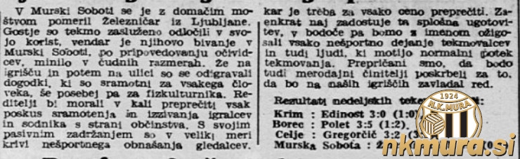 Fizkulturna zveza Slovenije je sporočila, da je zaradi neprimernega obnašanja gledalcev do sodnikov in igralcev suspendirala nogometno sekcijo Murske Sobote. Do končne preiskave je zaprto tudi igrišče na Fazaneriji, kar pomeni, da Murska Sobota doma ne sme igrati tekem. FZS je obenem sporočila, da je suspendirala še Karla Fujsa in Franca Kološo.