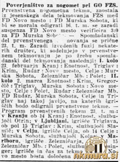 Tekma je bila odigrana 20. oktobra v Novem mestu in se je končala z 1:1. Murska Sobota se je nato pritožila na rezultat in FZS je tekmo razveljavil. Za nov termin je določil 16. februar 1947, ker pa je ekipa Novega mesta pod suspenzom in tekme ne more odigrati se le-ta registrira z 0:3 za naš klub.