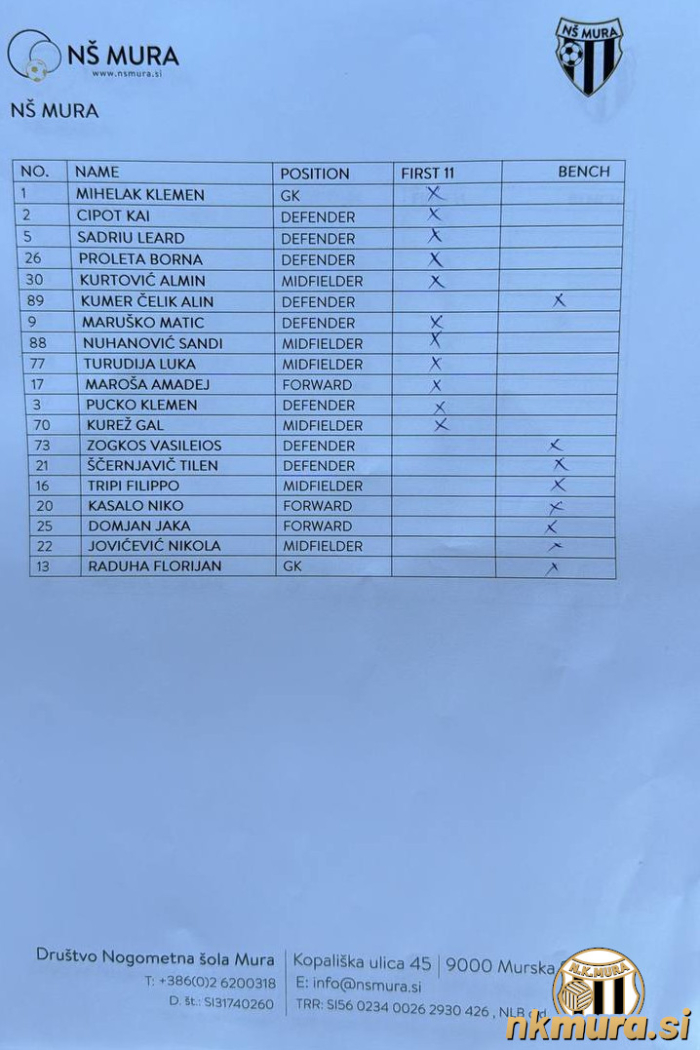Mura: Mihelak, Kurtovič, Sadriu, Cipot, Proleta, Pucko, Nuhanović, Maruško (od 71. Tripi), Pucko (od 71. Ščernjavič), Turudija (od 46. Jovićević), Kurež in Maroša (od 84. Domjan). Trener: Anton Žlogar.