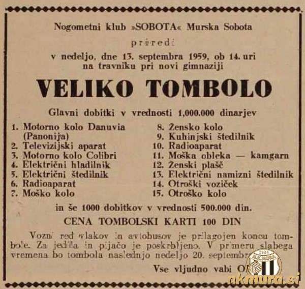 NK Sobota je v nedeljo, 13. septembra pripravila svojo tradicionalno tombolo. Pričela se je ob 14.00 uri na travniku pri novi gimnaziji.