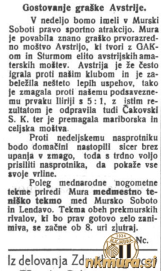 To je bila tretja mednarodna tekma v zgodovini SK Mure, Mura pa se je pomerila z enim izmed najuglednejših klubov doslej. Austria skupaj z GAK-om in Sturm-om tvori elito avstrijskih amaterskih moštev. Ta klub iz Gradca se je v preteklosti že večkrat pomeril z ekipami iz Slovenije. S 5:1 je premagal ljubljansko Ilirijo in Čakovečki SK, premagoval pa je tudi mariborska in celjska moštva.